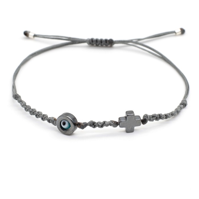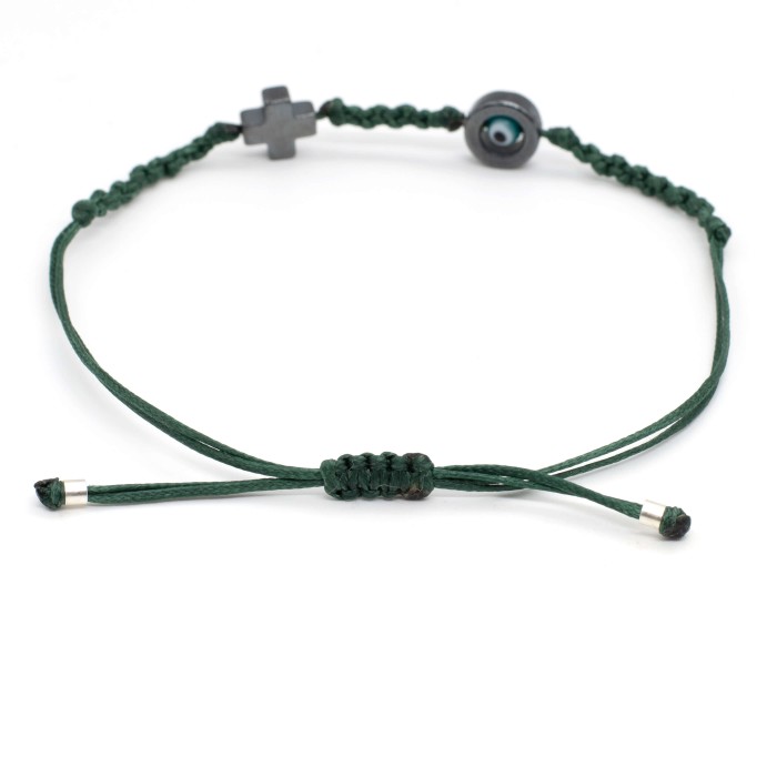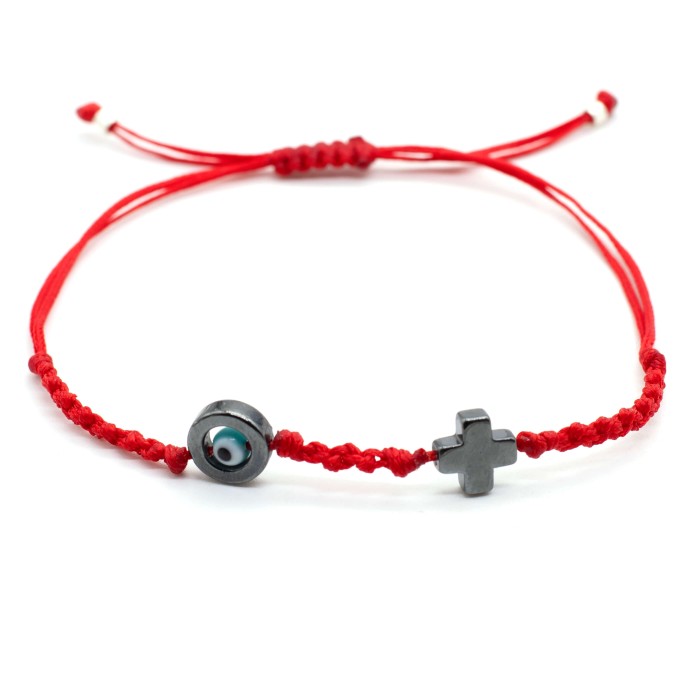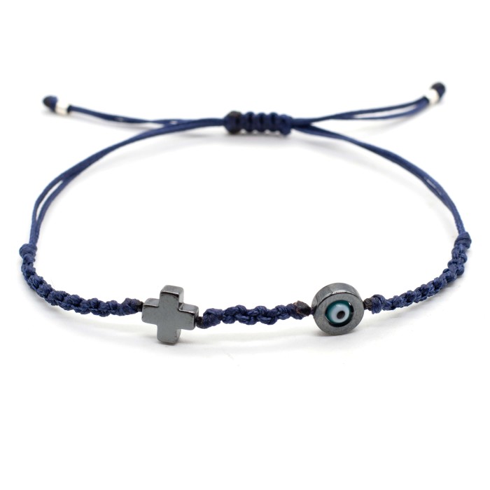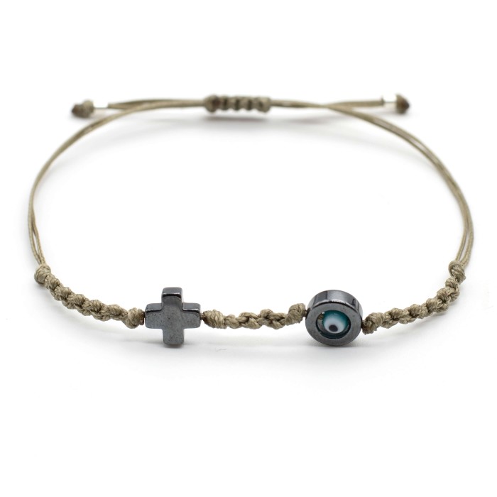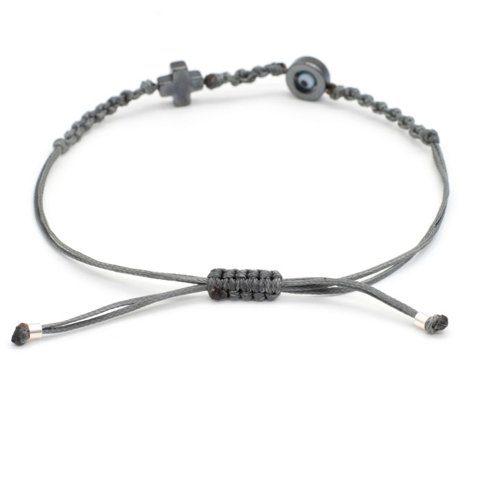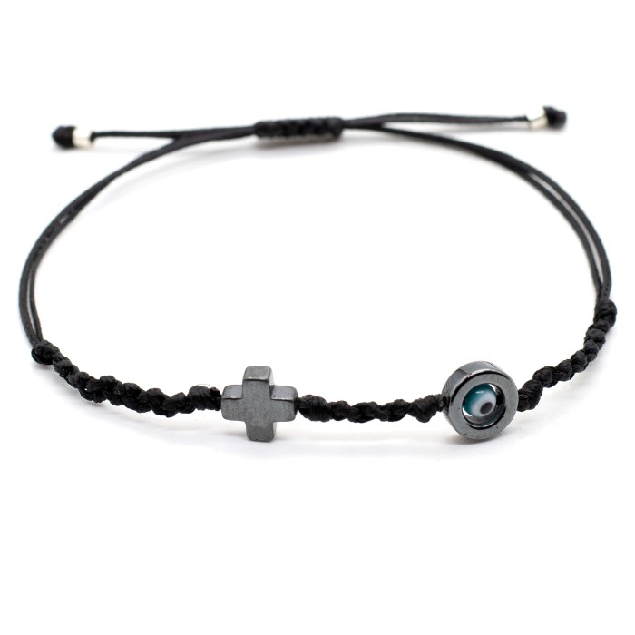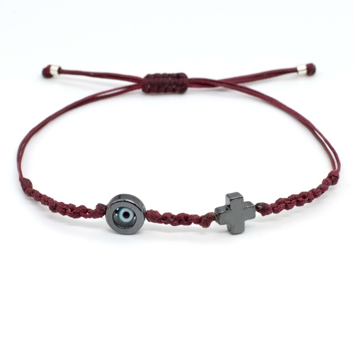 A handmade bracelet made out of cords, which adapts to the size of the hand (macrame). The cross (1.3*1.3 cm) and the evil eye's outline (1.3cm) are made out of chematite semiprecious stone . Its style is minimal, simple and everyday!
