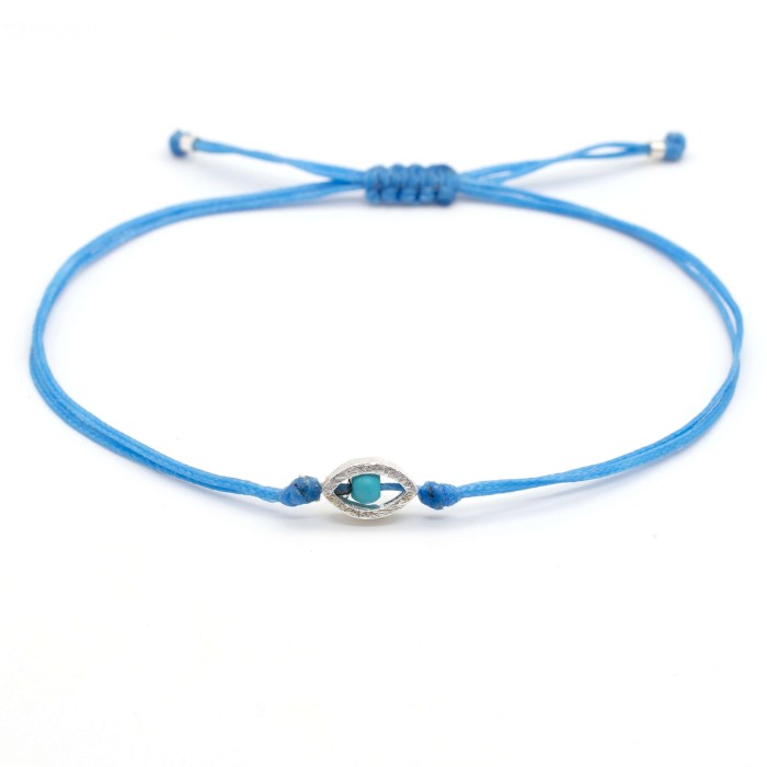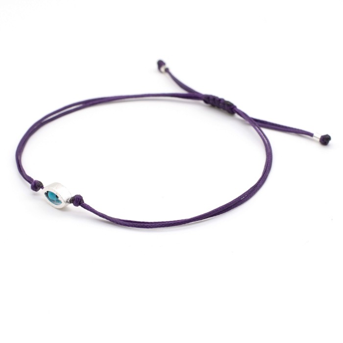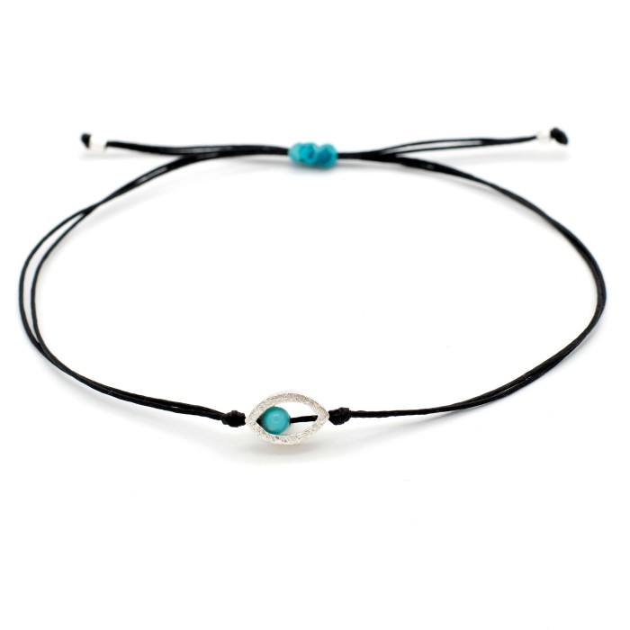 A handmade bracelet made out of cord and silver 925. The main characteristic of the bracelet is the silver 925, 0.9cm little evil eye, which is accompanied by a small turquoise. The bracelet's length is adjustable (macrame). A minimal jewel of unique elegance and chic design.