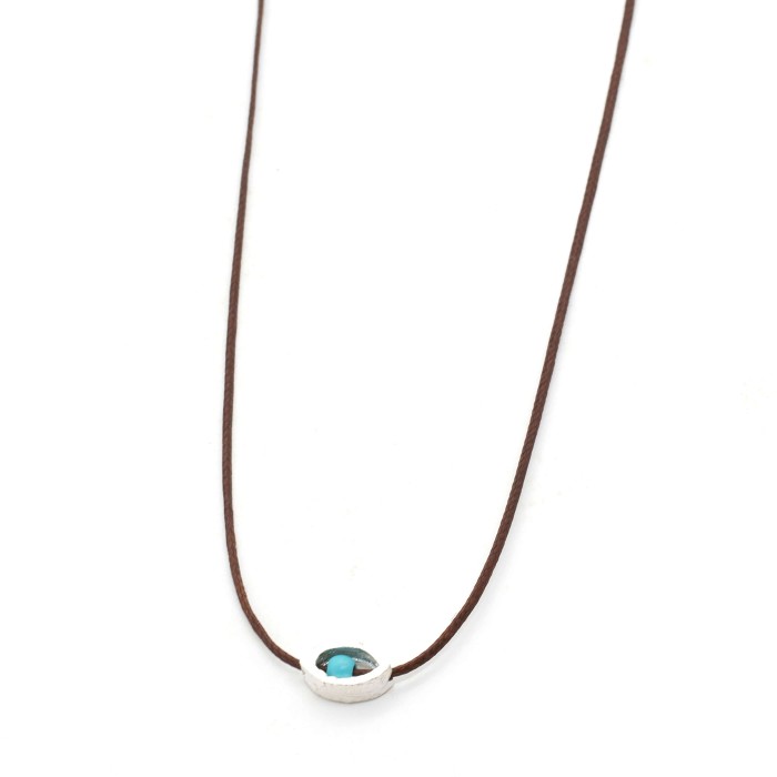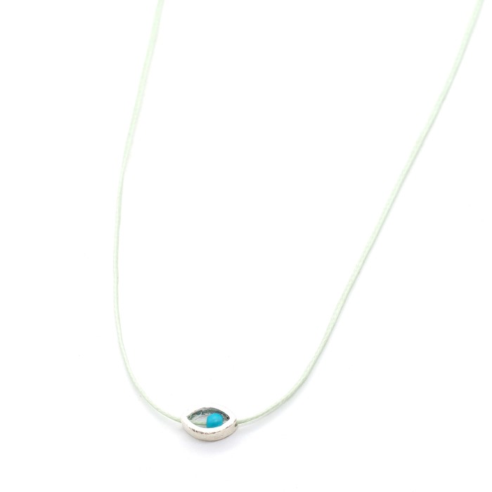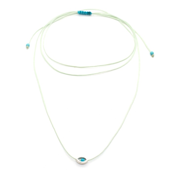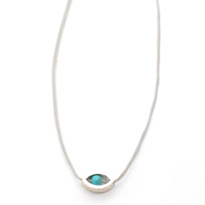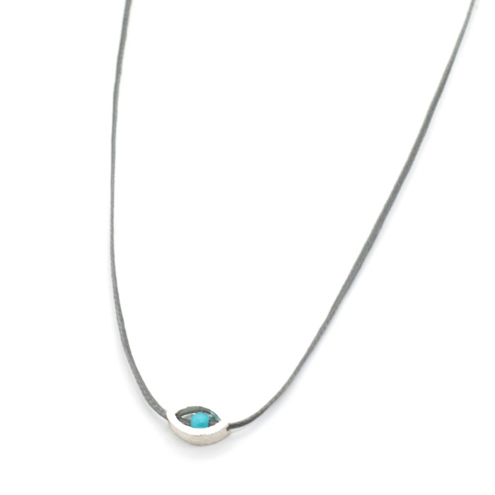 A handmade necklace made out of cord and silver 925. The main characteristic of the necklace is the silver 925, 0.9cm little evil eye, which is accompanied by a small turquoise. The necklace's length is adjustable (macrame). A minimal jewel of unique elegance and chic design.
