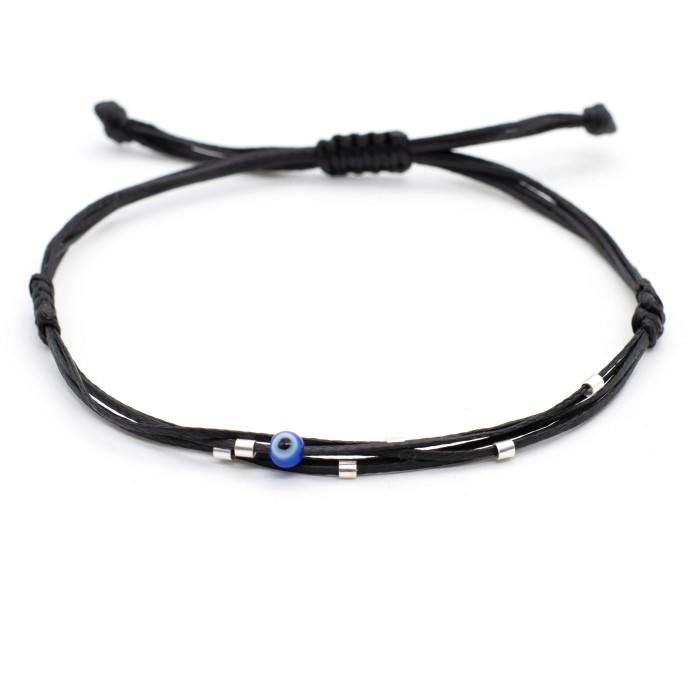 A handmade bracelet made out of cords ans silver 925. The little evil eye, which is the basic element of the bracelet, is moving alonside the bracelet's perimeter, as the silver drops too. A minimal jewel of unique aestherics, ideal for a style of difference and uniqueness. The bracelet's size is adjustable (macrame).