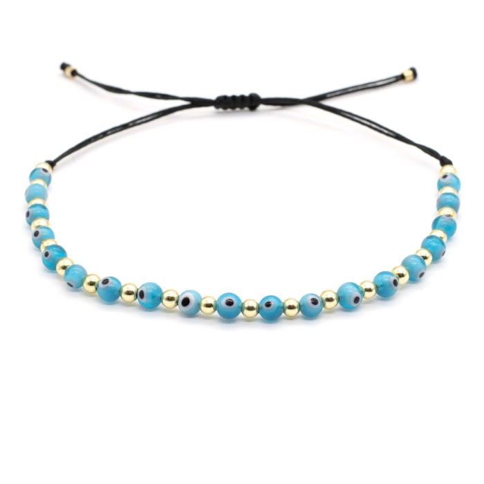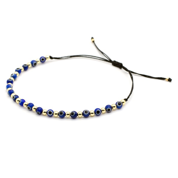 The "Nice Try, Evil Eye" bracelet features evil eye beads, hematites, and goldplated sterling silver 925 elements, in a handmade, adjustable design that mixes style and protection, and modern edge.