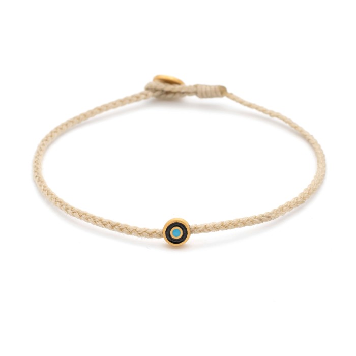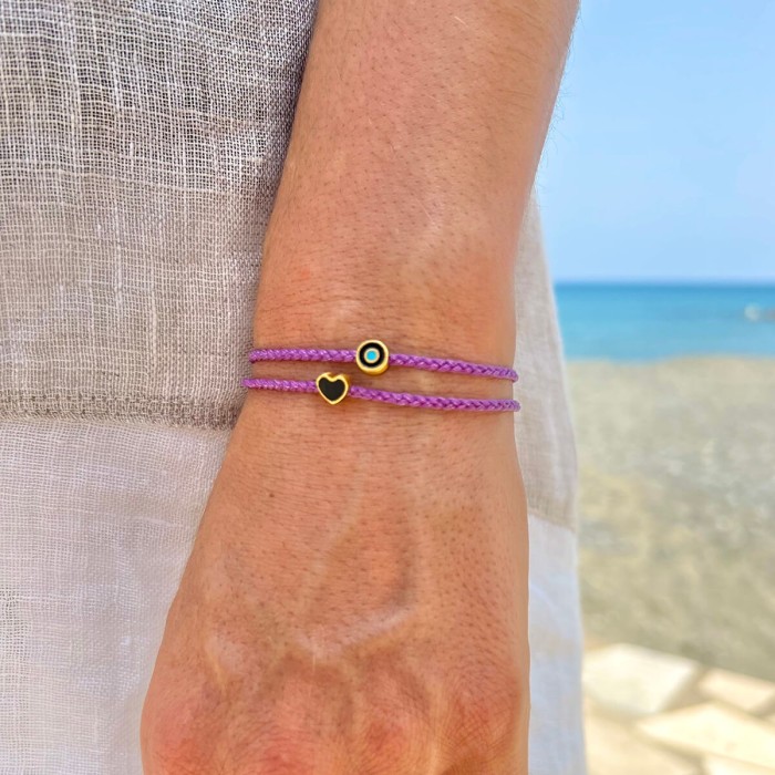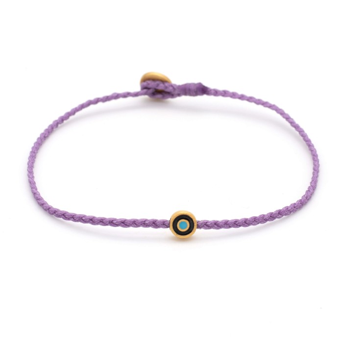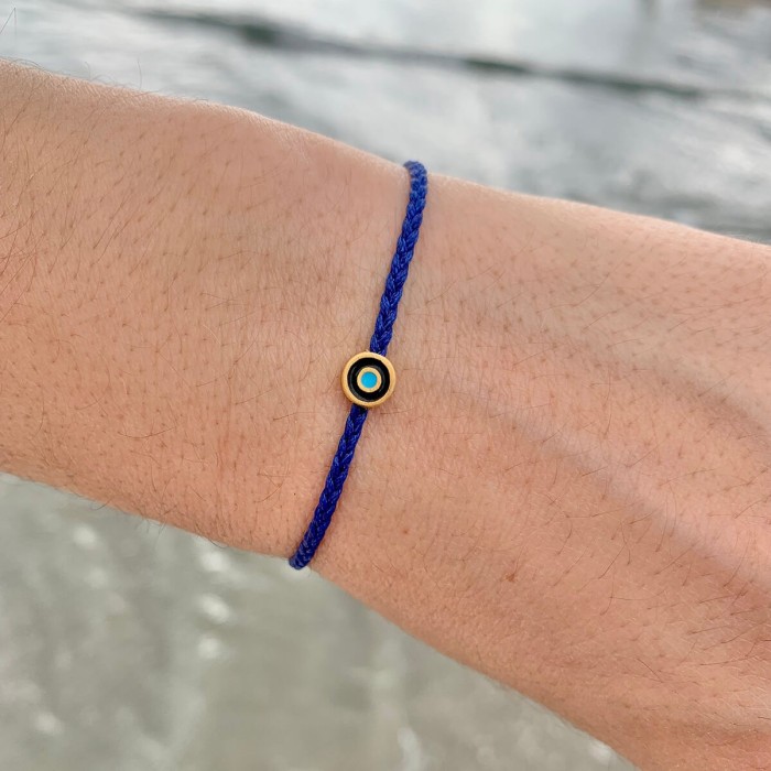 A handmade bracelet made of braided cord, which adapts to the size of your hand. It has an easy-going, everyday style. The Evil Eye and the clasp are from goldplated sterling silver.