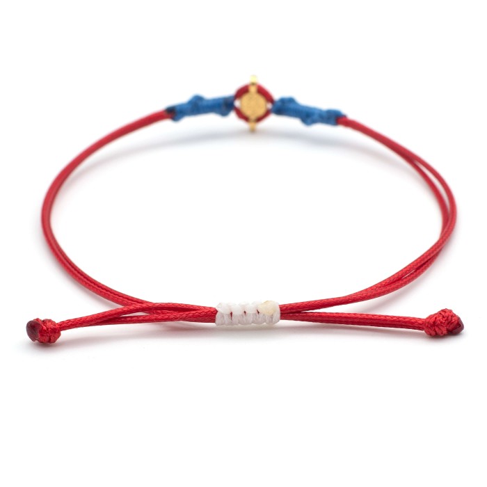 A handmade bracelet made of red, white and blue braided waxcords and red snakecord, which adapt to the size of your hand. It has an easy-going, everyday style. The designful goldplated evil eye element is made out of high quality zamak. Celebrate the Spring's arrival with the most beautiful way!