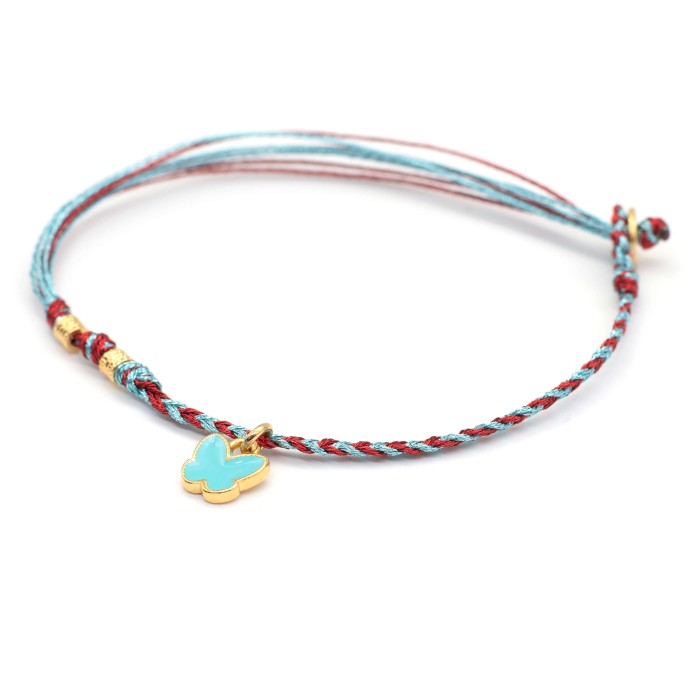 A handmade bracelet made of red/white braided waxcord, which adapt to the size of your hand. It has an easy-going, everyday style. The designful goldplated butterfly element is made out of high quality zamak. Celebrate the Spring's arrival with the most beautiful way!