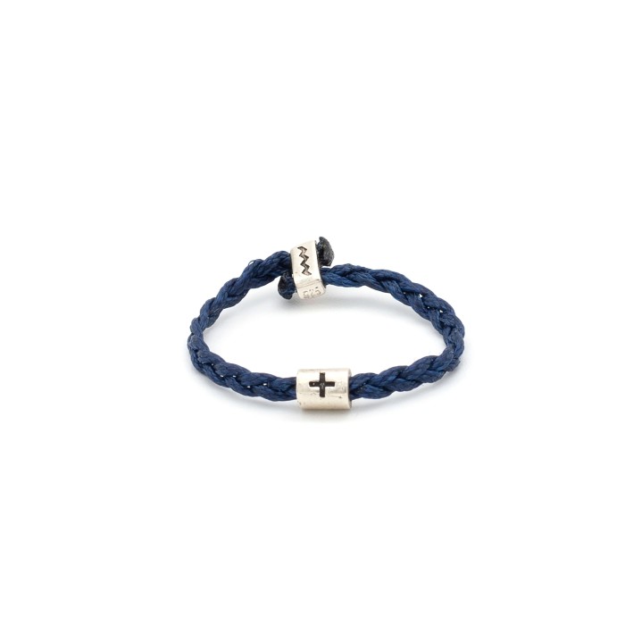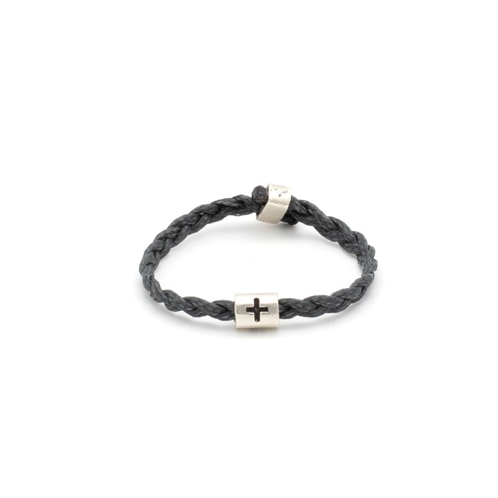 A handmade, unique ring made out of silver 925 and braided cord. The basic design is a small cross. Equally impressive is the fact that the ring is size adjustable. (at the bottom of the ring the user adjusts the braided cords and gives the ring its final size).