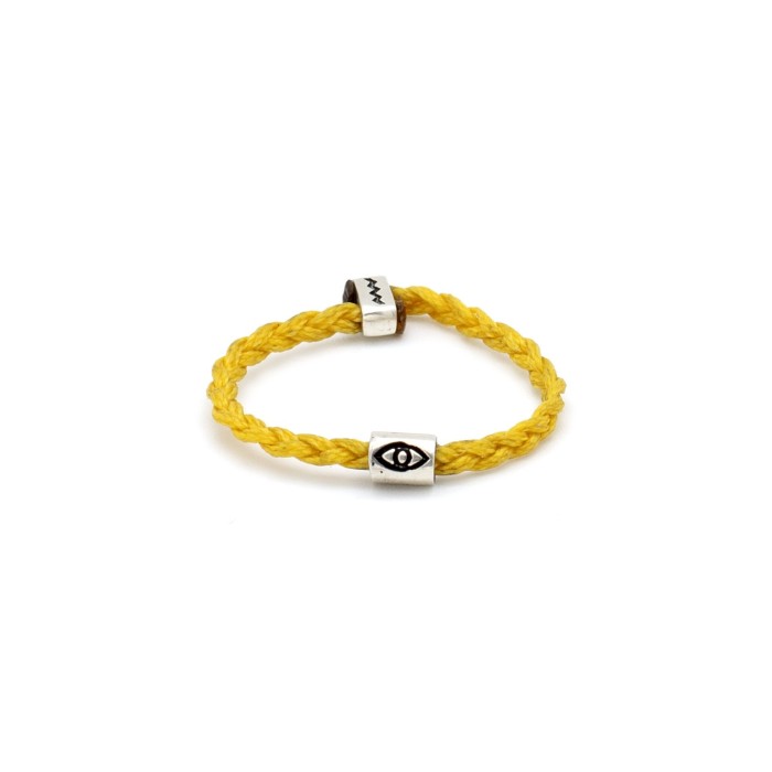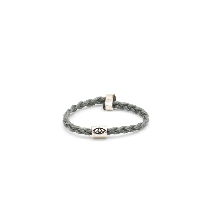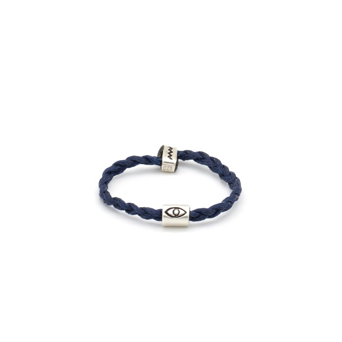 A handmade, unique ring made out of silver 925 and braided cord. The basic design is a small evil eye. Equally impressive is the fact that the ring is size adjustable. (at the bottom of the ring the user adjusts the braided cords and gives the ring its final size).