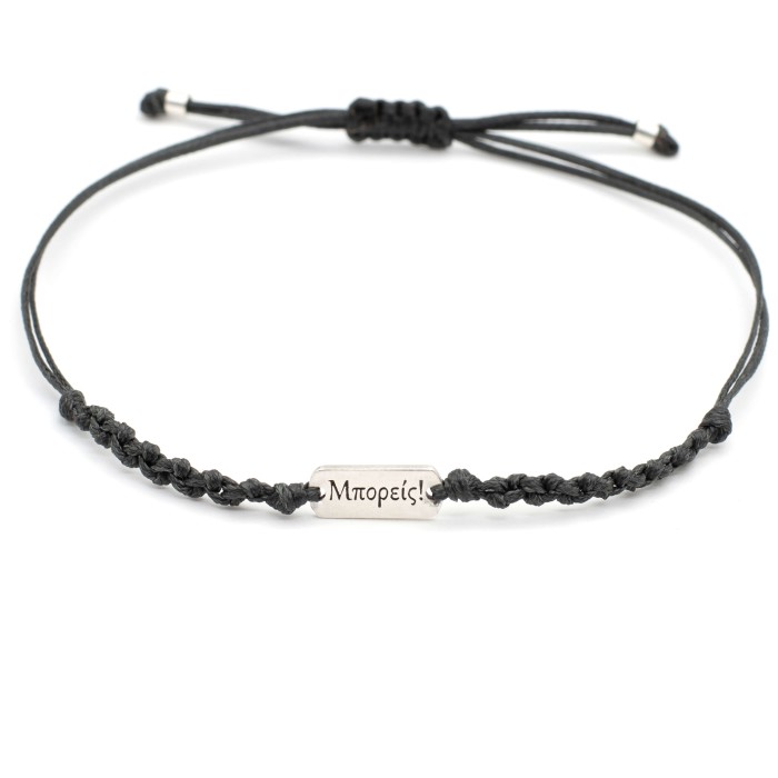 The "Mporeis! 1/2K" bracelet is a handmade accessory crafted from waxed cord and sterling silver 925. Featuring a macramé design, an engraved silver "baritsa" with the Greeklish message "Mporeis!" ("You can do it!"), and silver end elements, it blends inspiration and elegance with customizable cord colors.