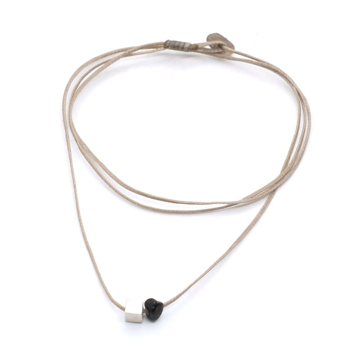 A handmade necklace made out of cord, an onyx semiprecious stone and silver 925. The main characteristic of the necklace is the well designed hanging cubical element. The clasp is also made out of silver 925 and the necklace's length is adjustable (max ~60cm).