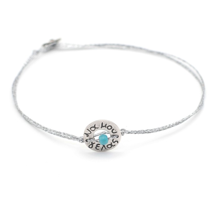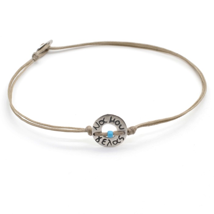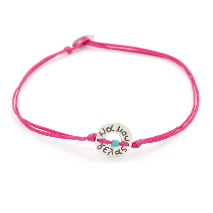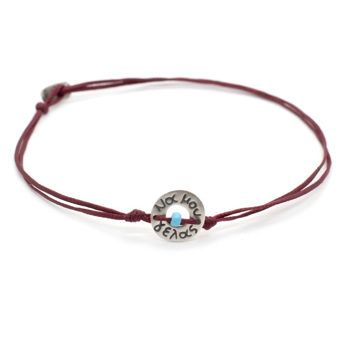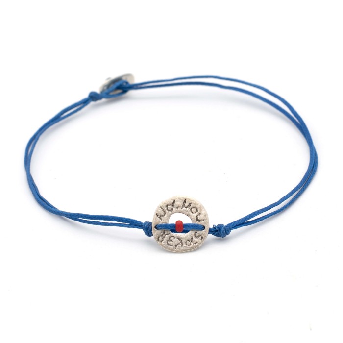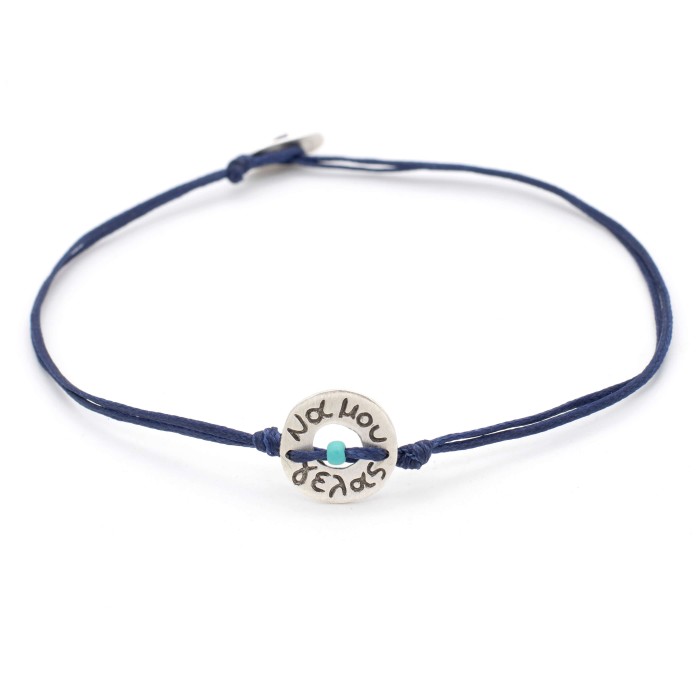 A handmade bracelet uniquely made out of a high quality cords. The central "να μου γελάς" - in the greek language has the exact meaning "smile at me". It is a saying that follows the skeptical that with a smile everything can happen and that this is the way to remind beauty. The central element and the clasp are made out of silver 925. The bracelet is size adjustable.