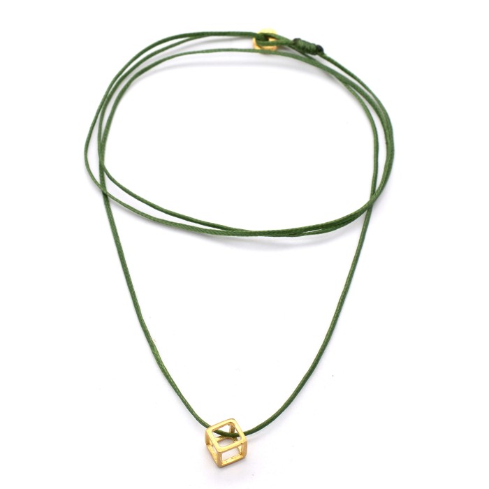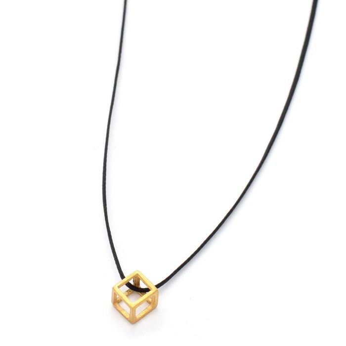 A handmade necklace made out of cord and goldplated silver 925. The main characteristic of the necklace is the well designed hanging cubical element (0,5*0,5*0,5 cm). The clasp is also made out of goldplated silver 925 and the necklace's length is adjustable (max ~60cm).