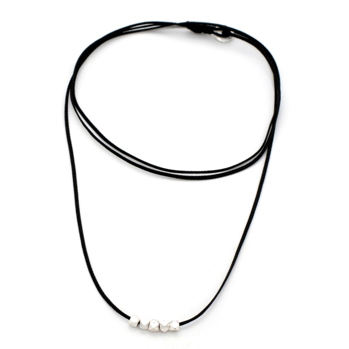A handmade necklace made out of cord and silver 925. The main characteristic of the necklace is the silver 925, little polygoniac elements. The clasp is also made out of silver 925 and the necklace's length is adjustable (max ~60cm). A minimal jewel of unique elegance and chic design.