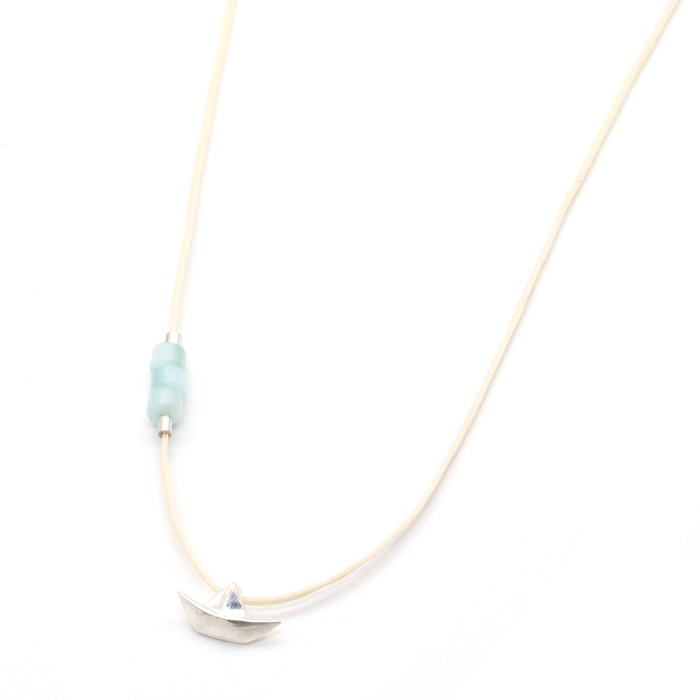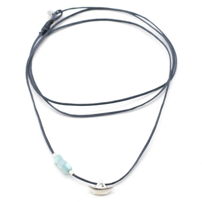 A handmade necklace made out of cord, clamshell semiprecious stones and silver 925. The main characteristic of the neckalce is the well designed little boat (dimensions ~1,0 cm * 0,5 cm) . The clasp is also made out of silver 925 and the necklace's length is adjustable (~60cm).