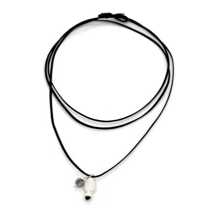 A handmade necklace made out of cord, a spinel semiprecious stone and silver 925. The main characteristic of the necklace is the well designed minimal fish (~1cm). The clasp is also made out of silver 925 and the necklace's length is adjustable (max ~60cm).