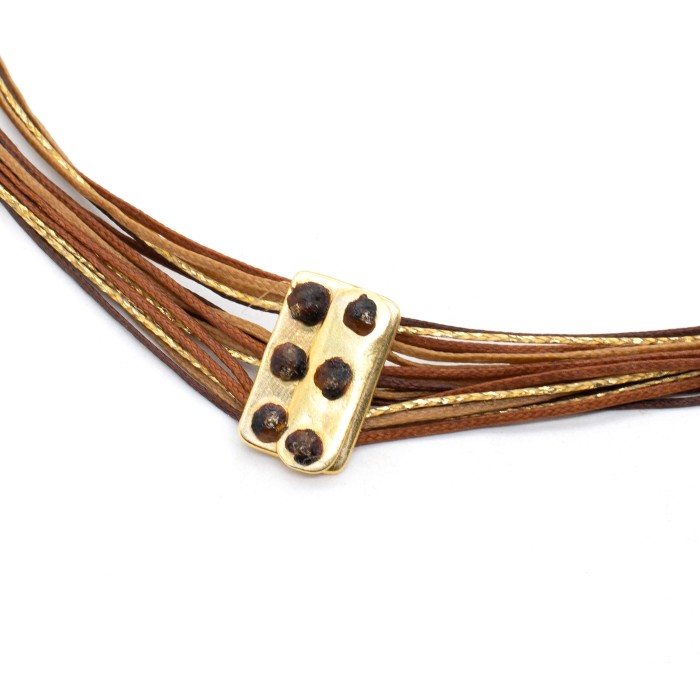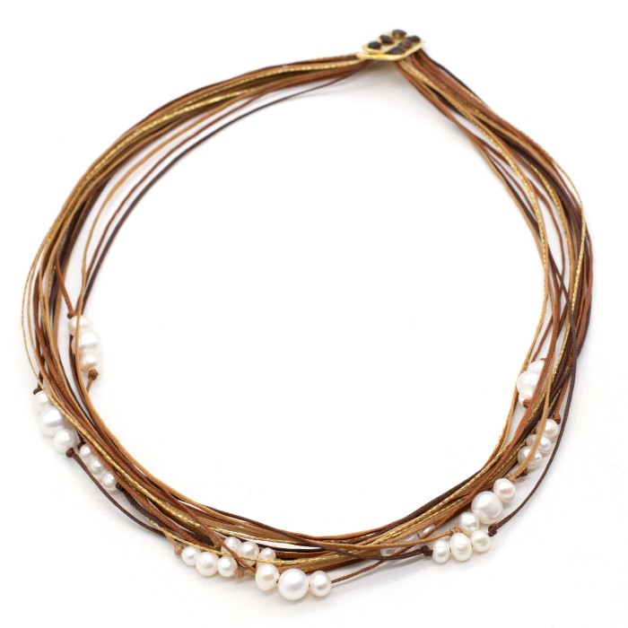 A handmade necklace made out of cord, pearls and goldplated silver 925. The main characteristic of the necklace is the beloved pearls. The length of the necklace is adjustable with a maximum length of 45cm. A maximal jewel of unique elegance and chic design.