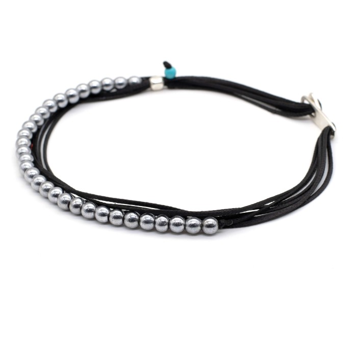 The "Odysseus" bracelet is a handmade creation with waxed cord and hematite stones, blending the timeless elegance. The bracelet's length is adjustable.