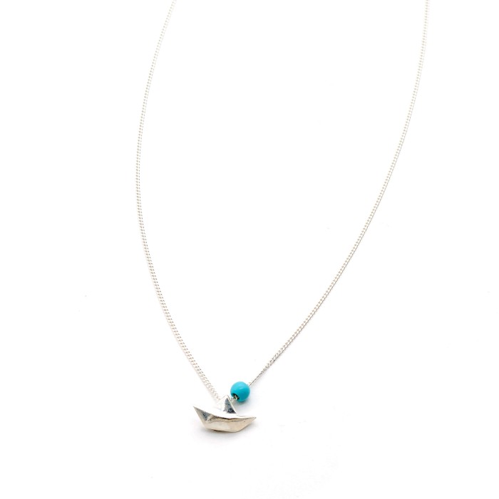 The "My Little Boat" necklace is a refined handmade piece crafted from sterling silver 925, inspired by the sea and freedom. The chain length is customizable, with an option to add a small turquoise howlite for a distinctive touch.