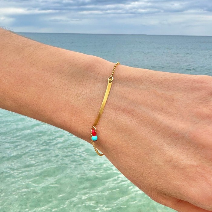 The Moment Minimal G CH bracelet blends gold-plated sterling silver 925 with a sleek bar and a small turquoise or red stone. You can remove the stone for a clean minimal look, while the adjustable chain ensures a perfect fit on your wrist.