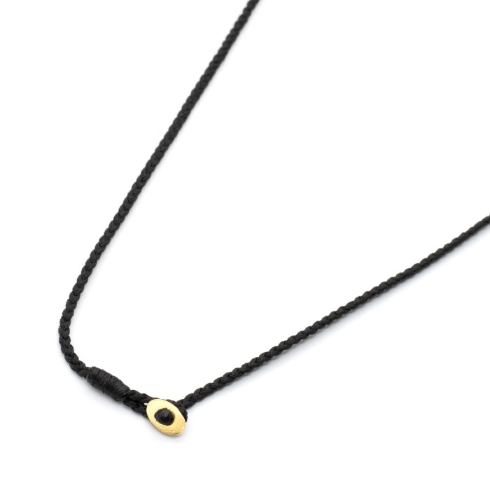The "Chaplet A G" is a handmade necklace featuring a gold-plated sterling silver 925 detail on braided cord. With customizable length and unisex appeal, it’s a refined everyday essential.