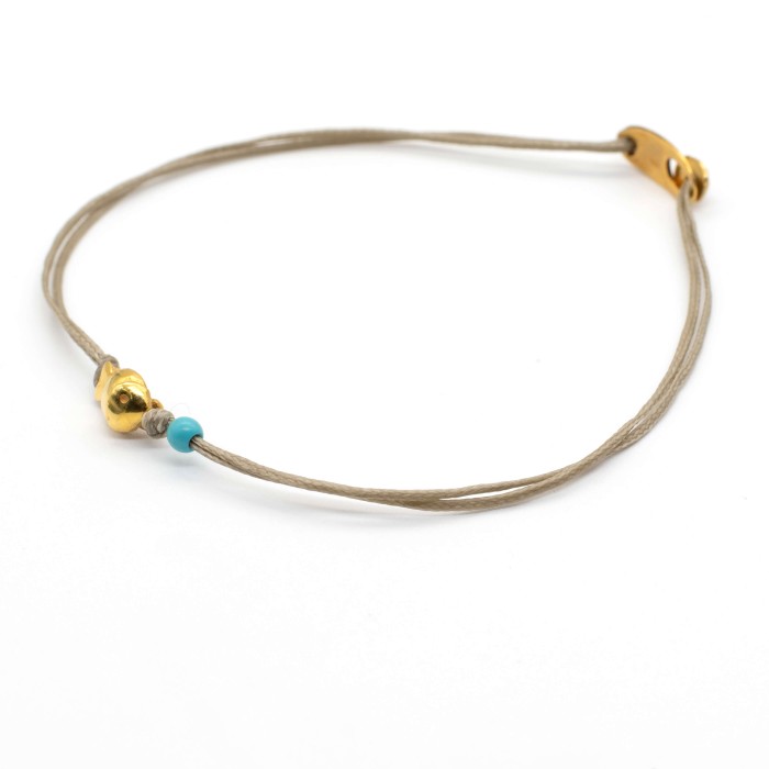 The "Little Fish Bobiras G" bracelet combines simple elegance with a playful touch. At its center lies a small gold-plated sterling silver 925 fish measuring 0.9 x 0.6 cm, accompanied by a tiny turquoise howlite bead. Its thin and durable adjustable cord ensures a comfortable fit, while the minimal design makes it perfect to wear alone or stacked with other bracelets.