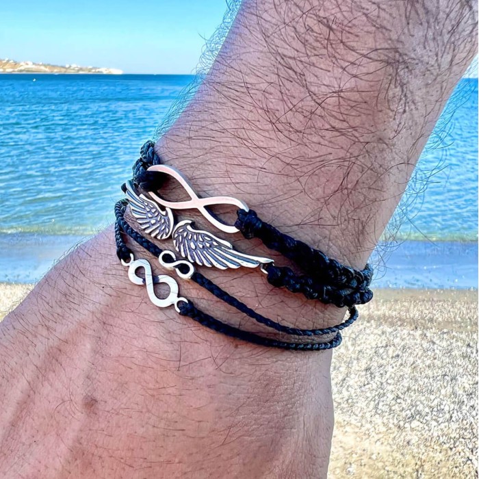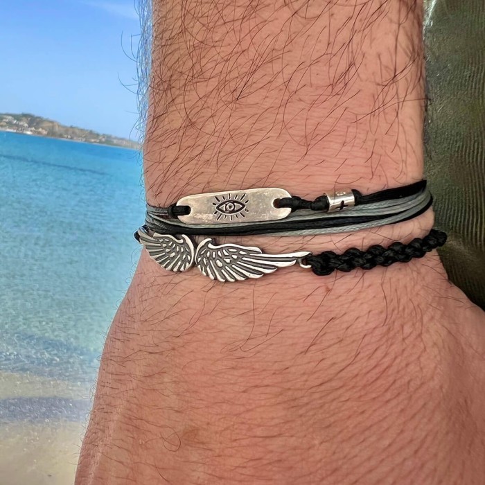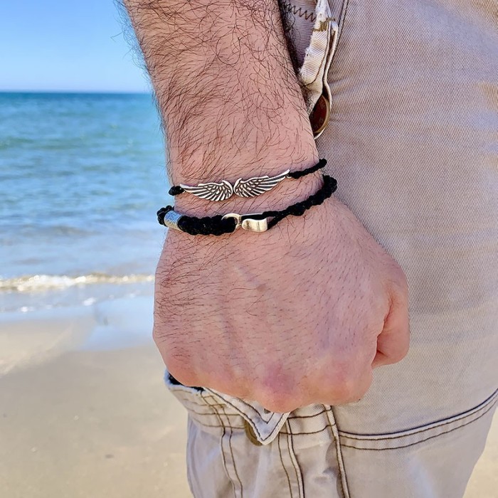 A handmade bracelet made out of black braided cord and silver 925. Its main detail is the two central wings alongside with two silver elements at the and of its macrame clasp. It is a rock style design. The brachelet's length is adjustable.
