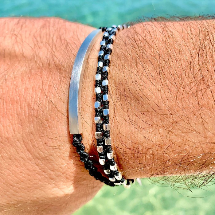 A handmade bracelet with braided black cord and is featured with macrame. The impressive bar (5cm) which is the main decorative element & the details are from sterling silver.