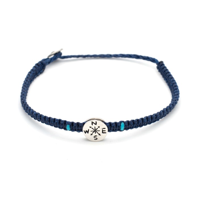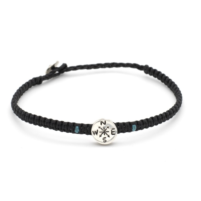 A specially handmade bracelet uniquely designed and made out of a high quality grey cord with red detailing. The main design element of the bracelet is a compass, which is made out of silver 925. The bracelet is size adjustable