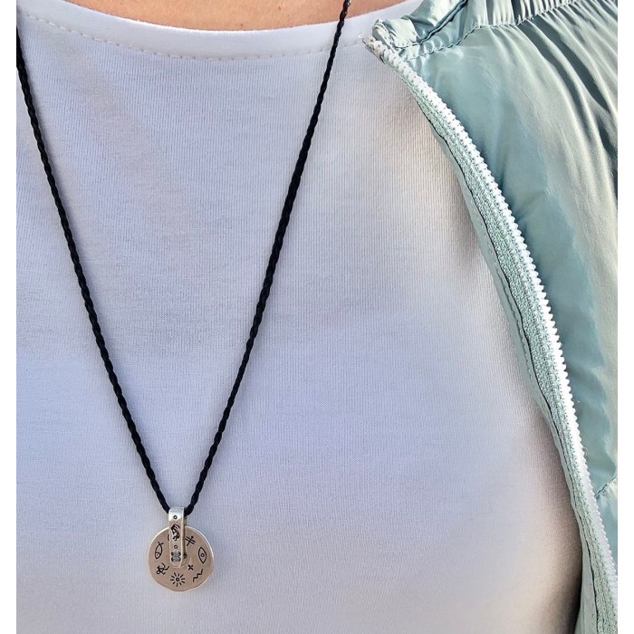 A handmade necklace made out of black braided cord with a maximum length ~33cm. The well designed hanging cirlce element that decorates the necklace is made out of silver 925 and it is inspired by the everyday life. The clasp is also made out of silver 925 and the necklace's length is adjustable.